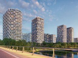 В одном доме (21 этаж) запроектировано 78 квартир. Помимо жилья, в здании появится кинотеатр, коворкинг, зона отдыха. Во втором доме переменной этажности — от 9 до 13 — предусмотрено 349 лотов.
